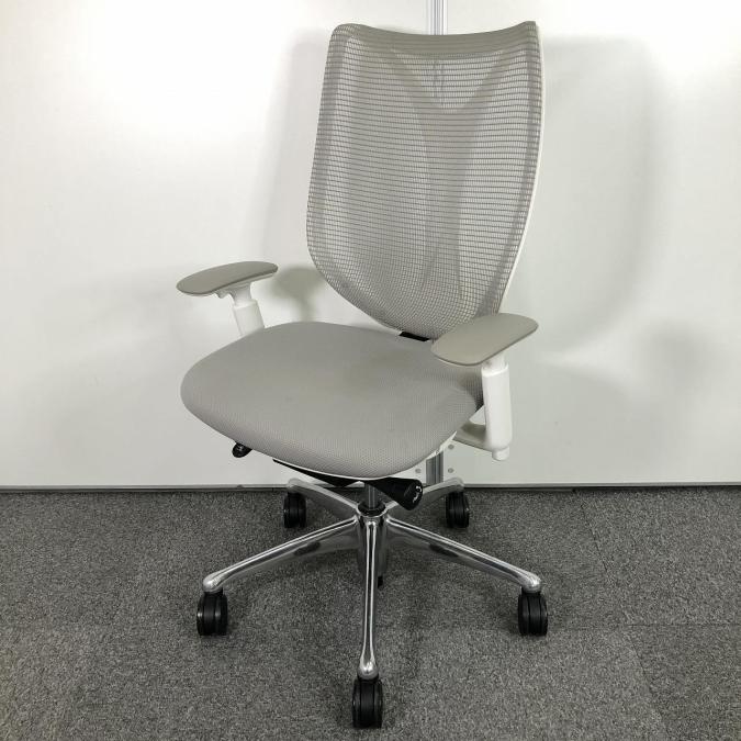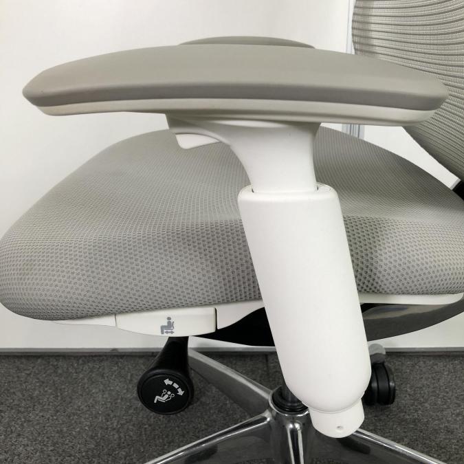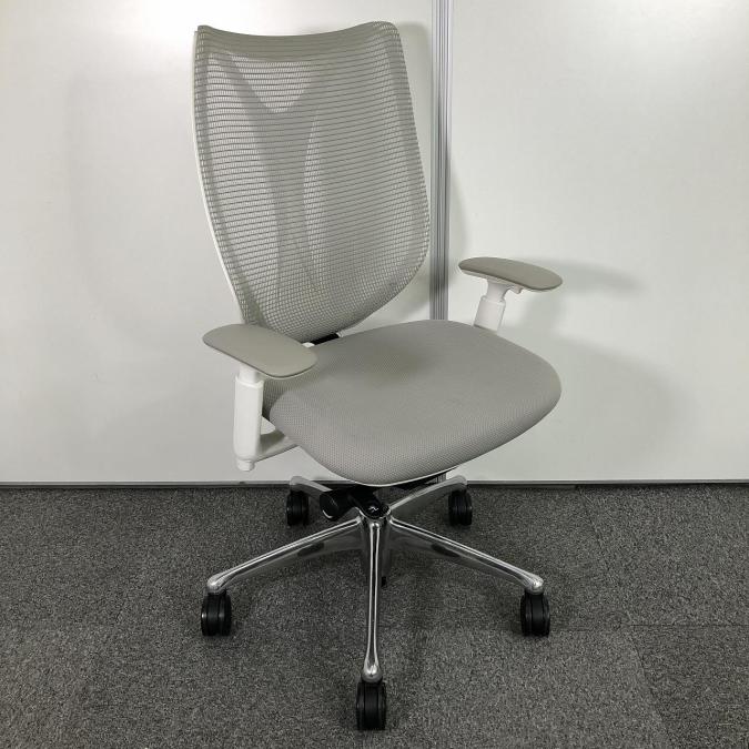 【前傾チルト付!流れるような美しいフォルムの最高級メッシュチェア!】■オカムラ(okamura)製 Sabrina(サブリナ)チェア 肘付ハイバック ■アジャストアーム(可動肘) ■背面メッシュ ■ライトグレー × ホワイトフレーム