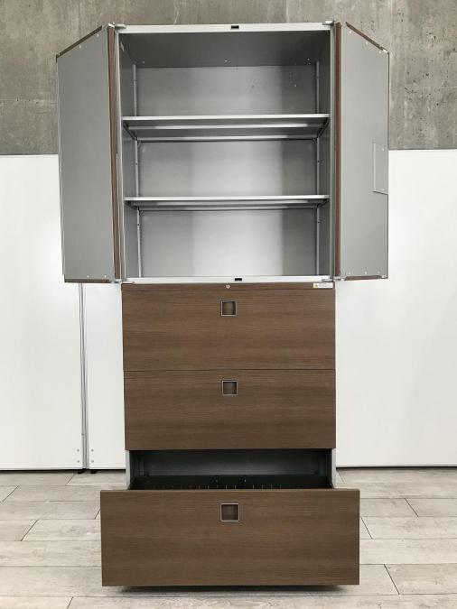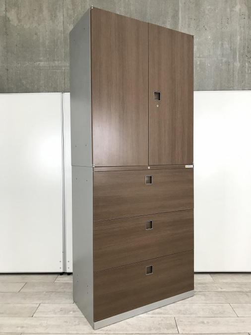 【上下書庫セット(両開き+3段ラテラル)】【高品質で使いやすいベストセラー商品!取っ手は上下左右のどこからでも操作できます!】■オカムラ(okamura)製 レクトラインシリーズ ハイキャビネット両開き+3段ラテラル ■正面:ブラウン/側面:シルバー ■シリンダー鍵在庫がある店舗一覧