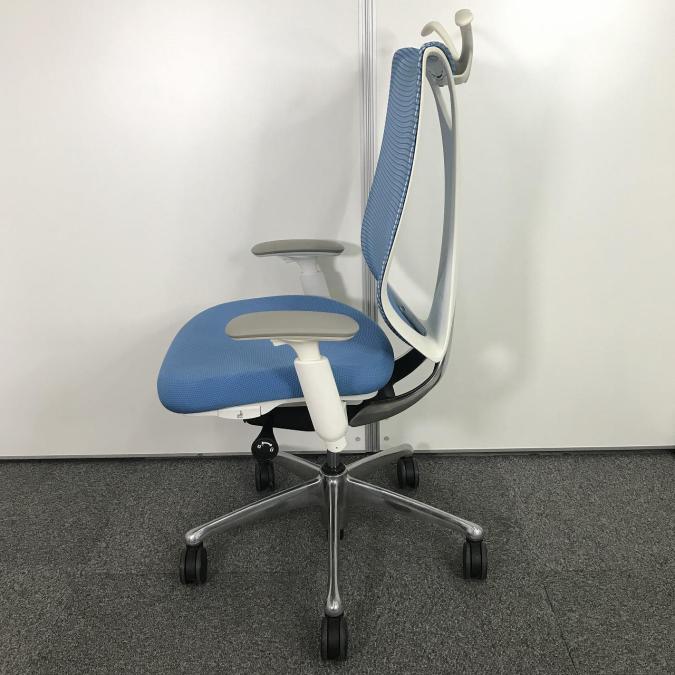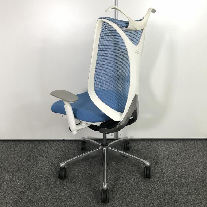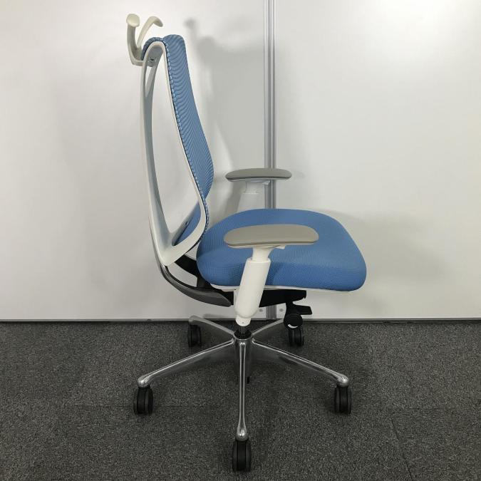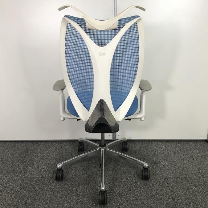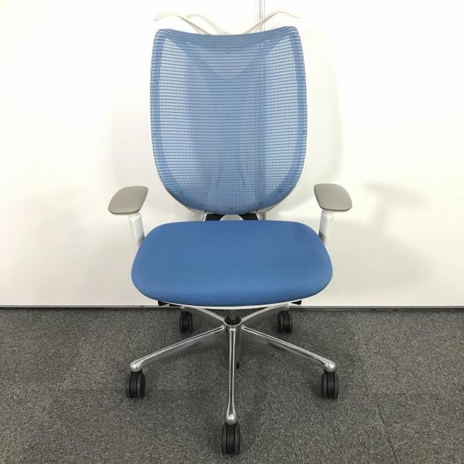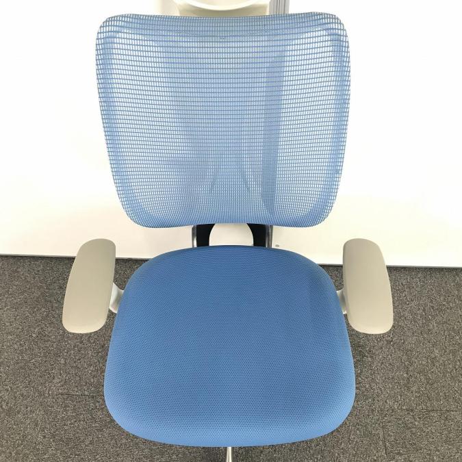 【前傾チルト付!流れるような美しいフォルムの最高級メッシュチェア!】■オカムラ(okamura)製 Sabrina(サブリナ) ハイバック 肘付き ■可動肘 ■背面メッシュ:アクアブルー 座面:ブルー ホワイトフレーム 【座面にダメージがあるためお値下げ商品】