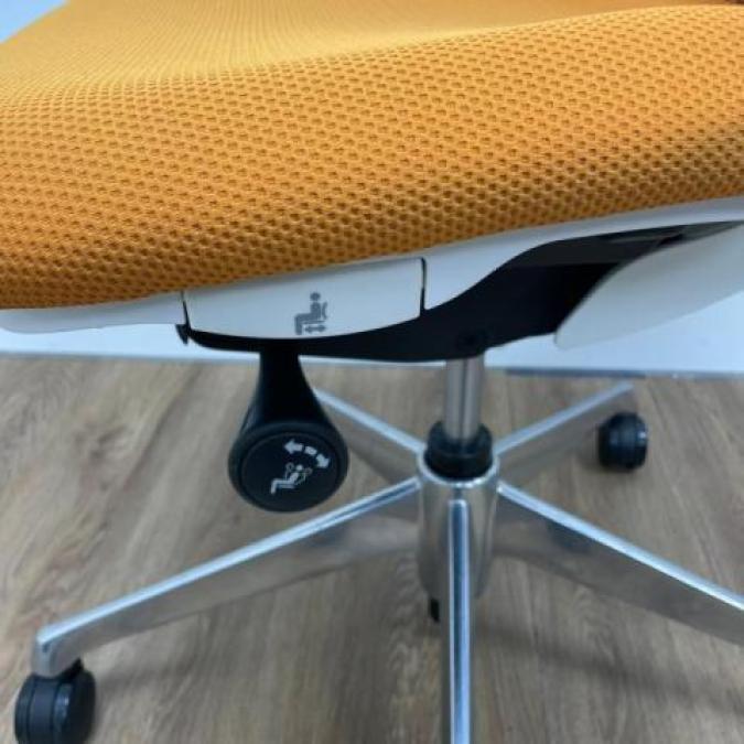 - 座面左下のダイヤルでリクライニングの固定と解除が行えます。 前傾ポジションをとることも可能です。