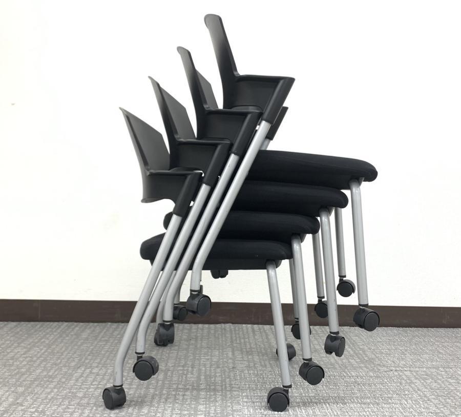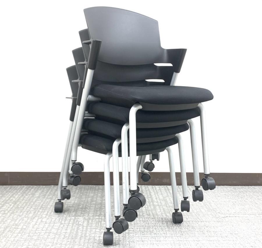 【6/16・8脚入荷予定!】【シンプルスマートなスタッキングチェア!分厚いクッションで長時間でも快適な座り心地!】■コクヨ製 プロッティ スタッキングチェア 肘付ミーティングチェア ■固定肘 ■キャスター付 ■ブラック ■背面樹脂 オフィスバスターズ梅田本店
