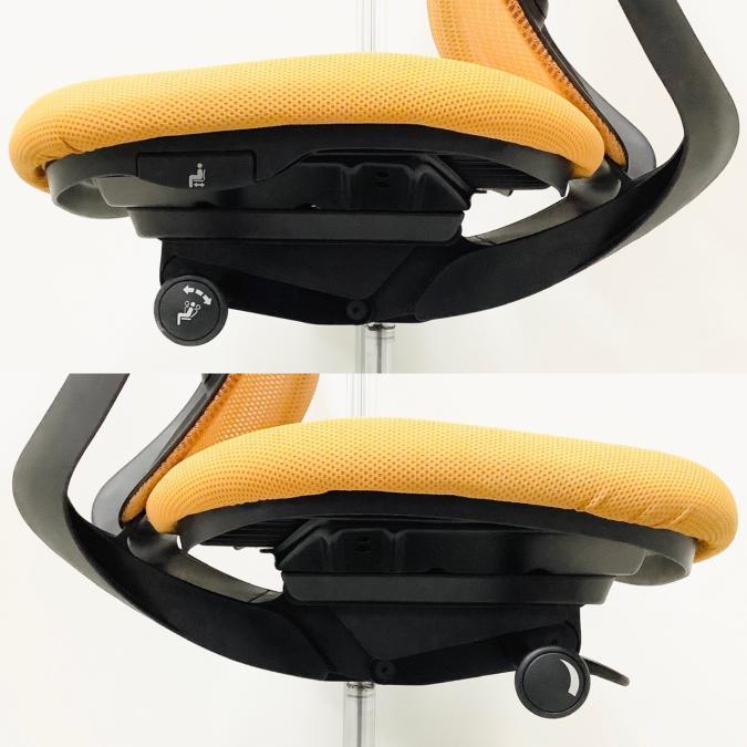 - 座面右下のダイヤル操作で、リクライニングの強弱調整が行えます。これまでのダイヤル式よりも、少ない回転数で、最弱?最強の調整が可能です。