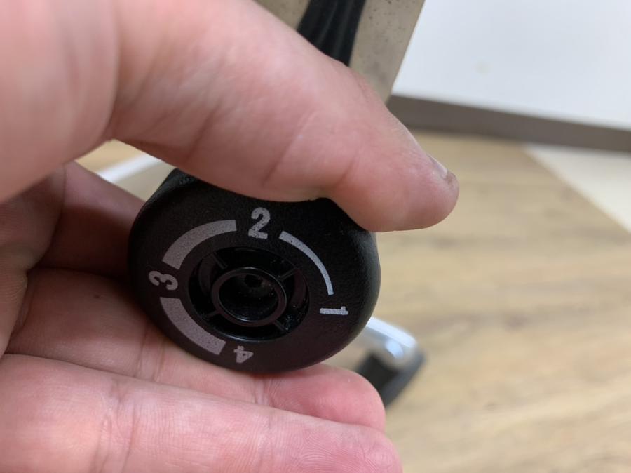 - ロッキングの強弱を調整するダイヤルがございます。体型に合わせてリクライニングの固さを座ったままで調整できます。