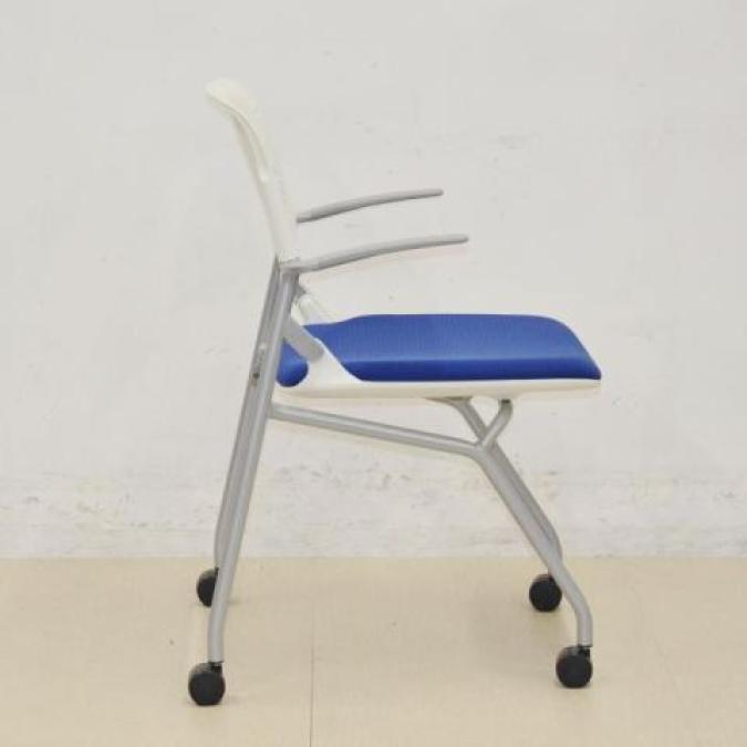 【25③在庫入替セール品】嬉しい小肘付きのネスティングチェア ◆オカムラ ルナチェア ブルー / 会議 / 研修 / セミナー / 打ち合わせ / 休憩室 / 折りたたみチェア / 収納チェア / 中古 / 格安- 福岡博多店
