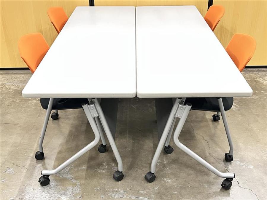 テーブル2台+チェア4脚で1セット!【4人で使用可能!使わないときは省スペース収納!】 ■サイドスタックテーブル 長机 幅:1800mm ■幕板付き キャスター付き ■ミーティング 会議室 セミナー 受付- 在庫数
