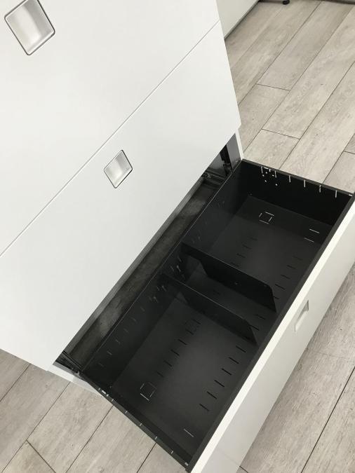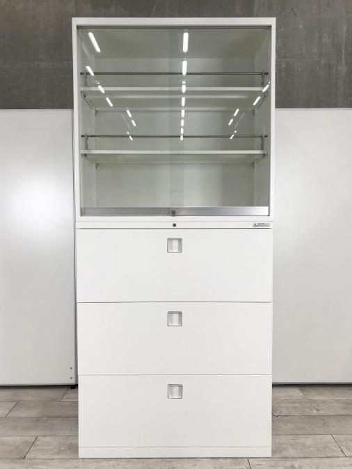 スライド式の扉+引き出しタイプの便利な書庫セットが入荷!使い勝手抜群のハイキャビネットが入荷! ■オカムラ/レクトライン/ホワイト 2枚引き戸+3段ラテラルキャビネット