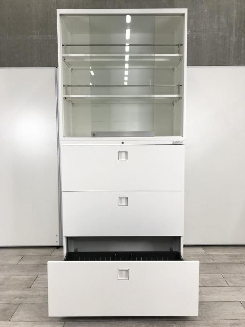 スライド式の扉+引き出しタイプの便利な書庫セットが入荷!使い勝手抜群のハイキャビネットが入荷! ■オカムラ/レクトライン/ホワイト 2枚引き戸+3段ラテラルキャビネット