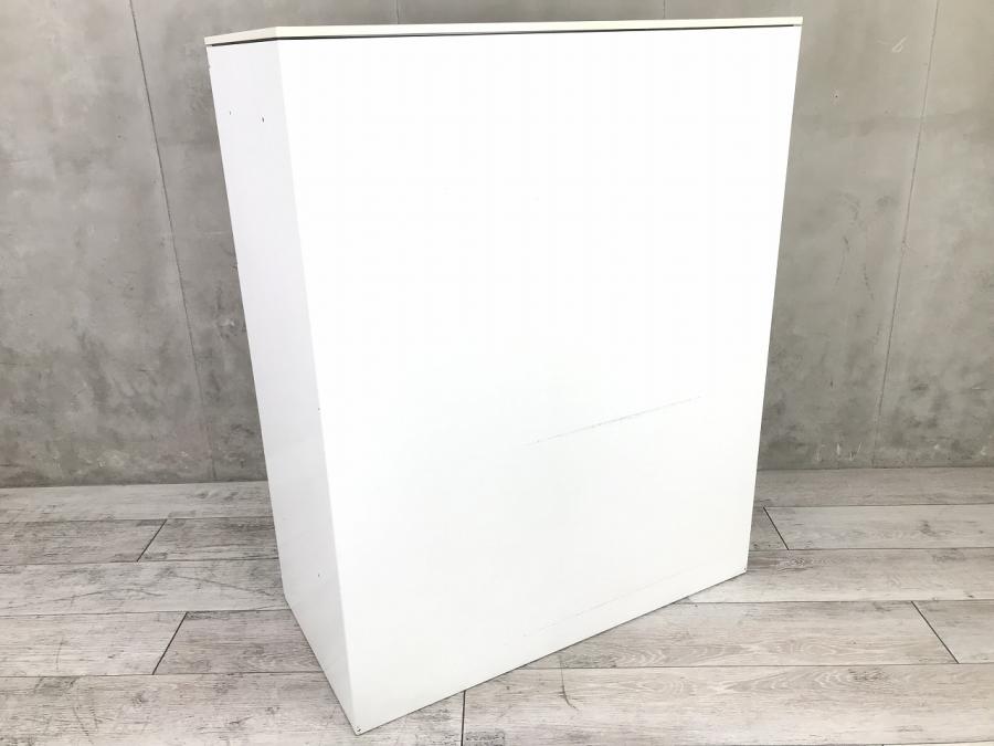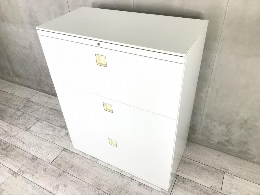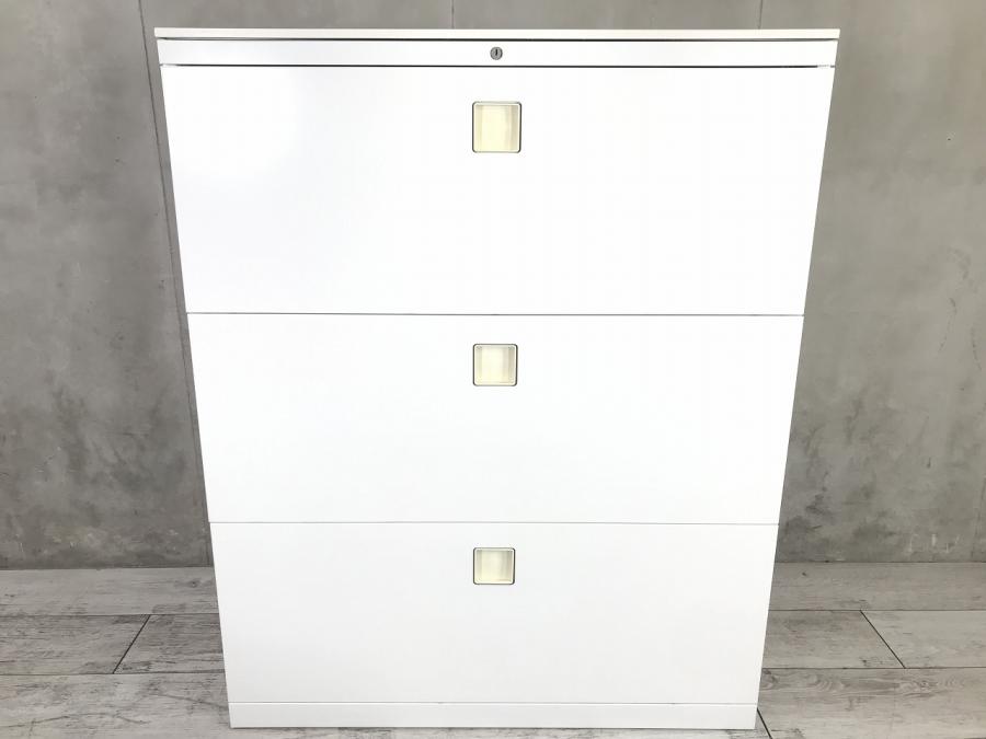オカムラ レクトライン 3段ラテラル書庫 ホワイト天板 シリンダー錠 鍵付き ※取っ手部分に若干日焼けあり