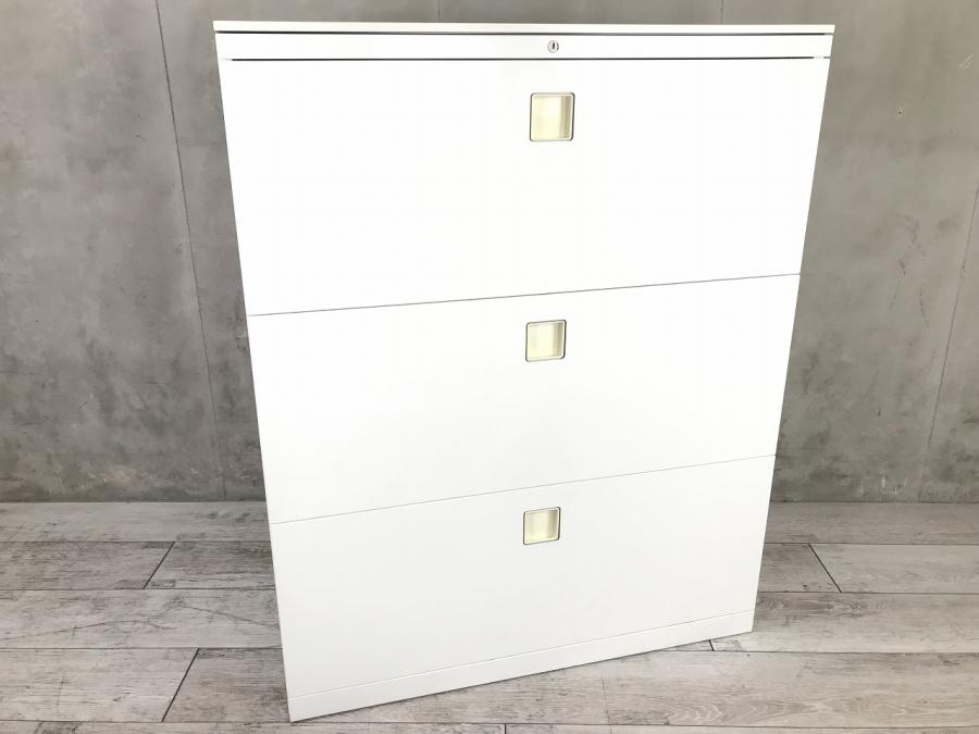 【オフィスの必需品!大容量の三段キャビネット!】■オカムラ(okamura)製 レクトラインシリーズ 3段ラテラル ローキャビネット ■ベース付 ■シリンダー錠 ■ホワイト 【弊社使用欄:A01037187】