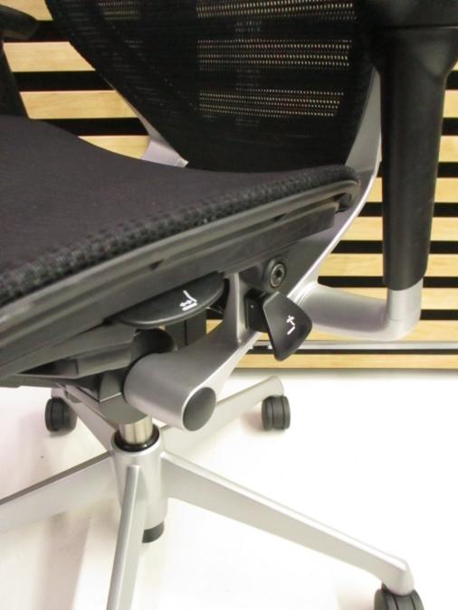 両手を自然に下ろした位置にあるレバーにて、座面の前後スライド調整(前後50mm)が可能です。