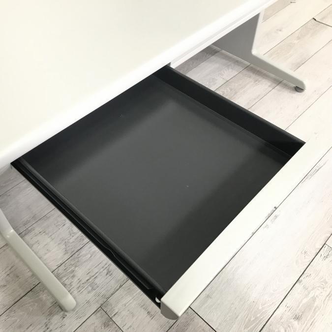 - 袖机のワゴンは、最下段がロング引出しになっており、従来より収納力120%アップ。