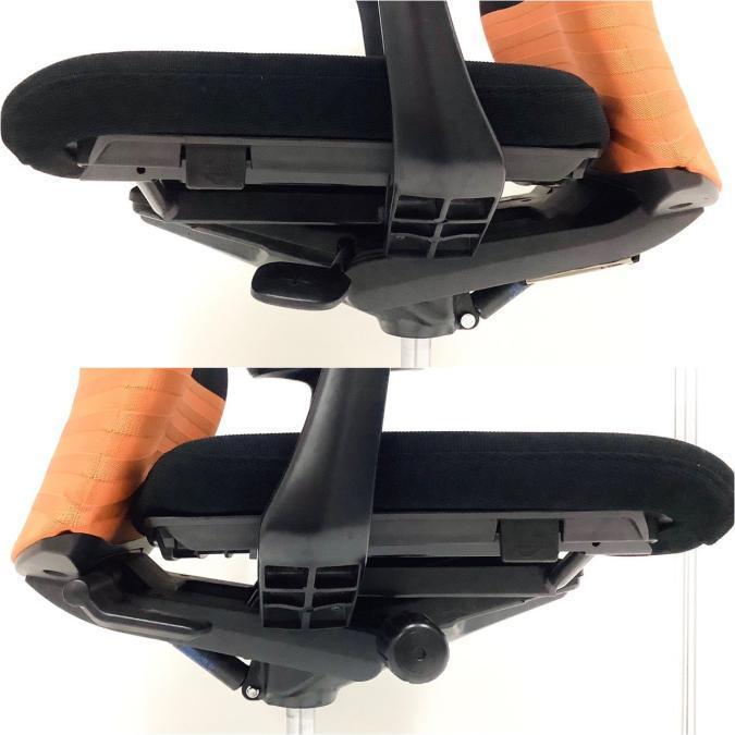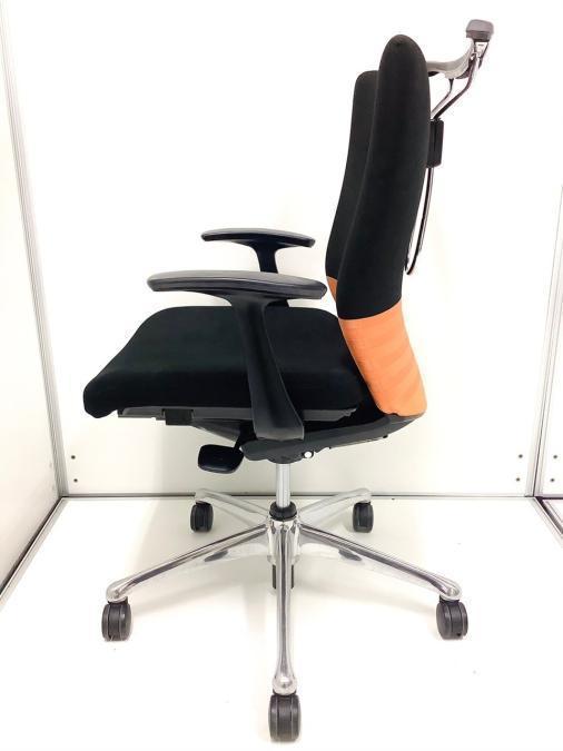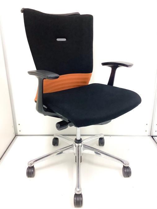 【人間工学に基づいた快適な座り心地!背あてのしなやかな曲線が背中にフィット!】■オカムラ製 フィーゴチェア (feego) 肘付きミドルバック シームレスタイプ ■固定肘 ■ブラック×オレンジ ※コートハンガー外し跡のある商品となります。【入替セールにつき30%OFF!】