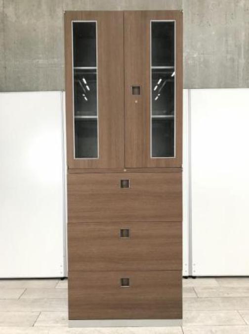 【フォーマルな空間にもフィット!】■オカムラ レクトラインシリーズ 上下書庫セット(両開き+3段ラテラル)木目扉タイプ ■役員室・応接室にもオススメ!