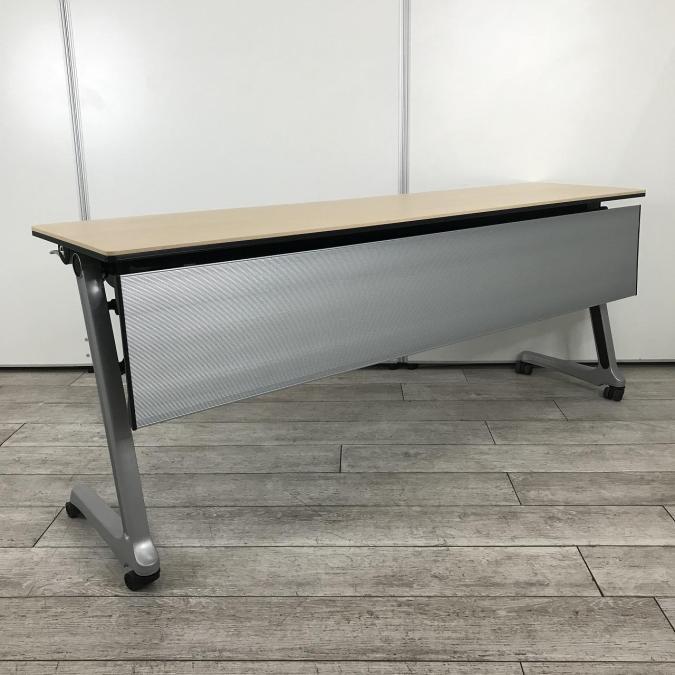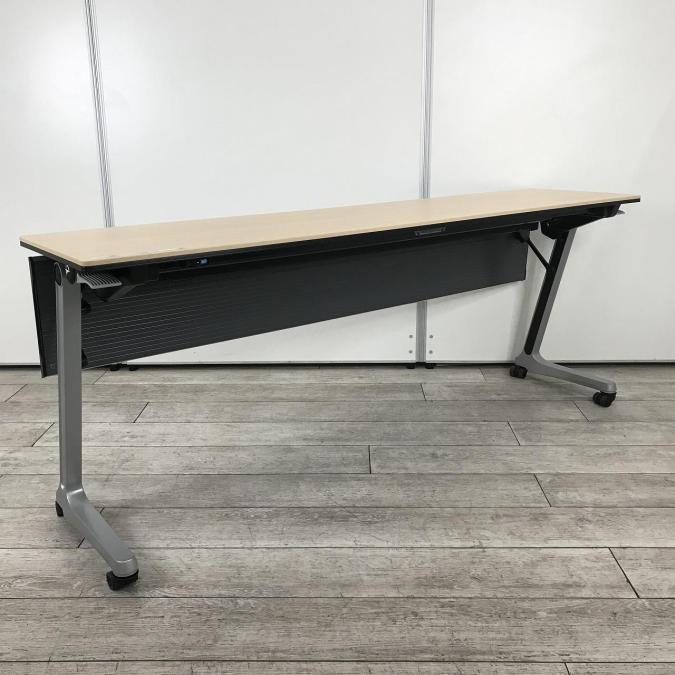 【折りたたみ収納が秀逸・スタイリッシュなデザインのサイドフォールドテーブル!】■オカムラ(okamura)製 インターアクトPRO サイドスタックテーブル 幅1800mm 幕板パネル付 ■木目調ナチュラル天板- つくば店