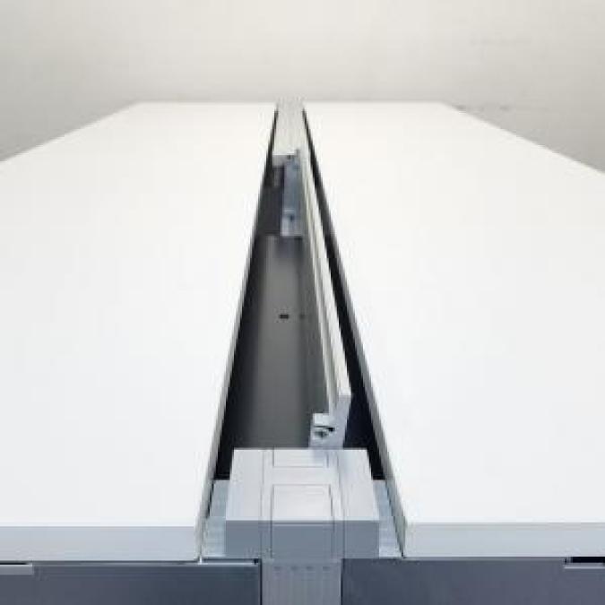 PCの電源やLAN回線等のコードを収容する大型コードダクトを備え、