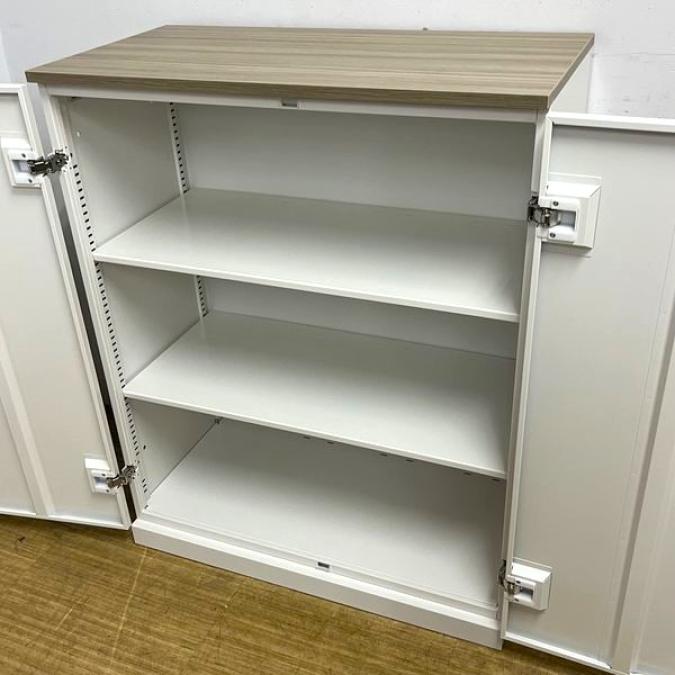 【書類の収納スペースを増やしたい方に!収納力抜群な観音開きタイプのキャビネット】■イトーキ製 (ITOKI)製 エスキャビネット(eS) 両開き ローキャビネット H1120㎜ ■ホワイト/天板:木目ブラウン ■シリンダー錠 【フラットで美しい!】