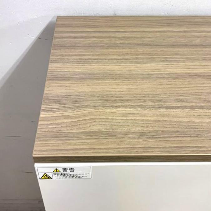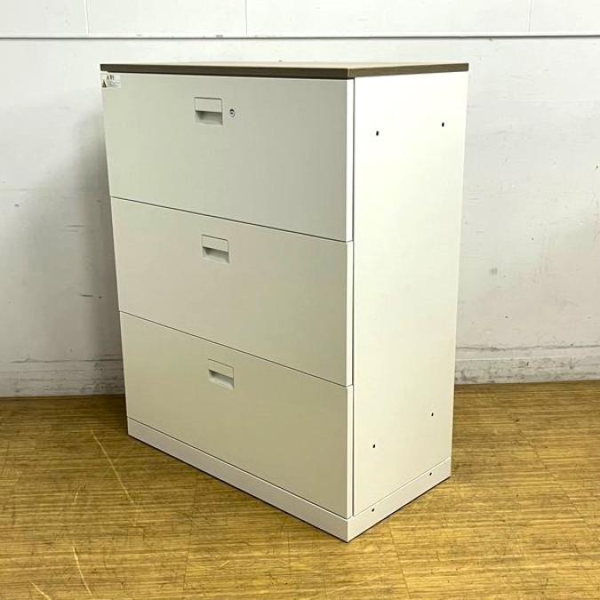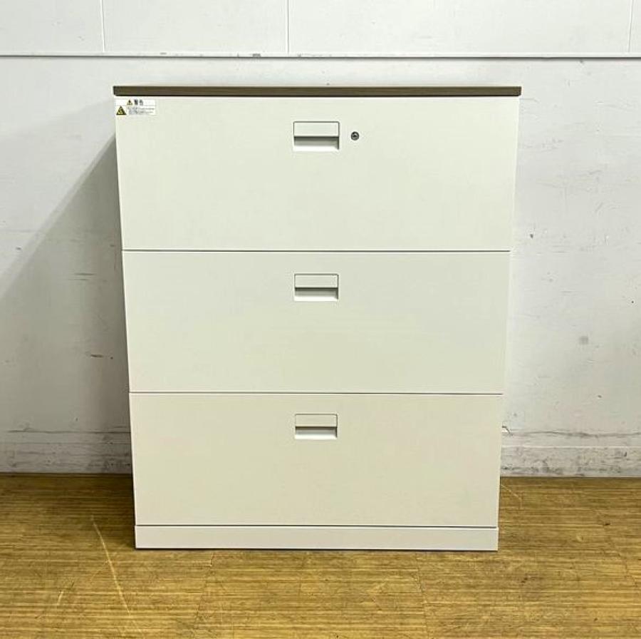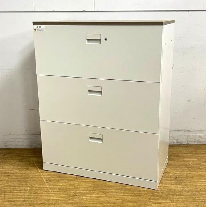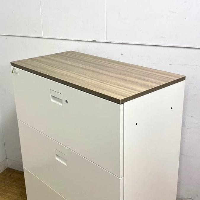 【状態良好】イトーキ エスキャビネット 3段ラテラル書庫 鍵付き シリンダー錠 ホワイト 天板付き(アッシュドオークM色) 収納物が上から確認できる引出し型- 名古屋千種店