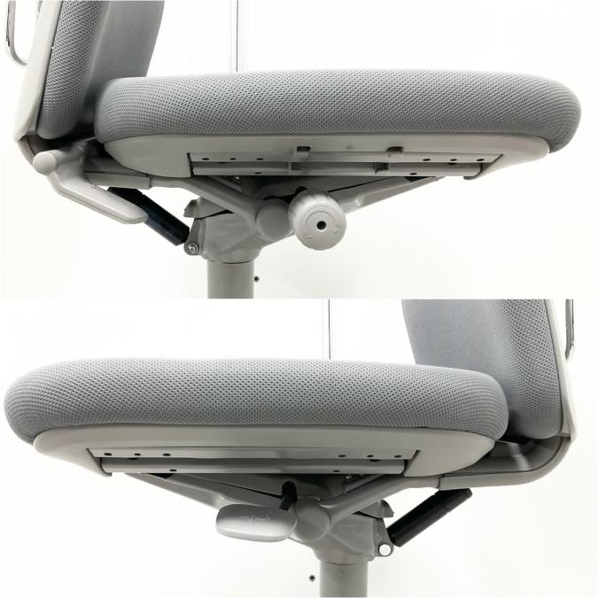 もう一つは、オカムラ社独自の""異硬度クッション""が座面に採用されていることです。これは座面が位置により異なる硬さのウレタンでできており、前方は腿裏を圧迫しないようソフトに、後方はしっかりと体重を支えるために少し硬めに作られています。クッション性とホールド感の両立により、長時間の作業での疲れを軽減してくれます。"