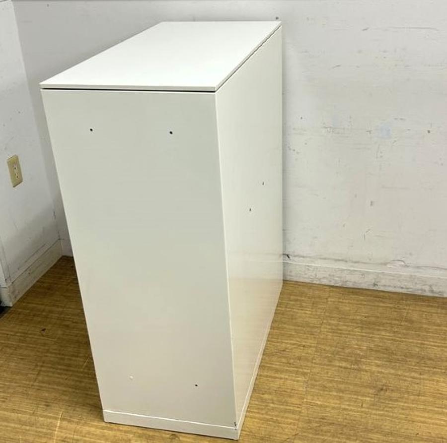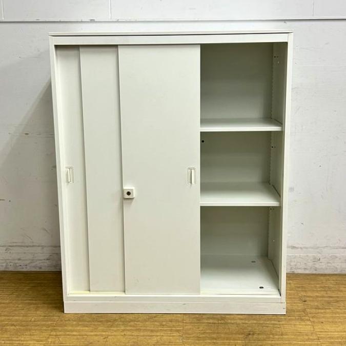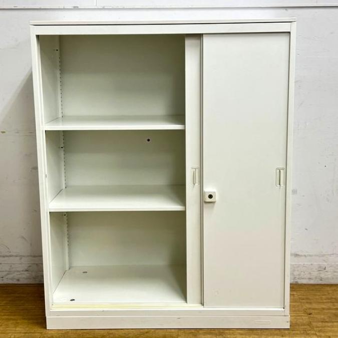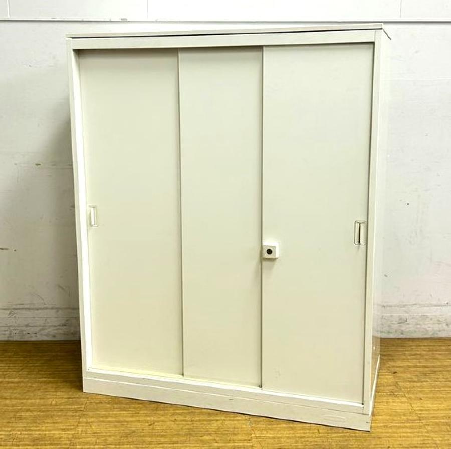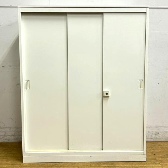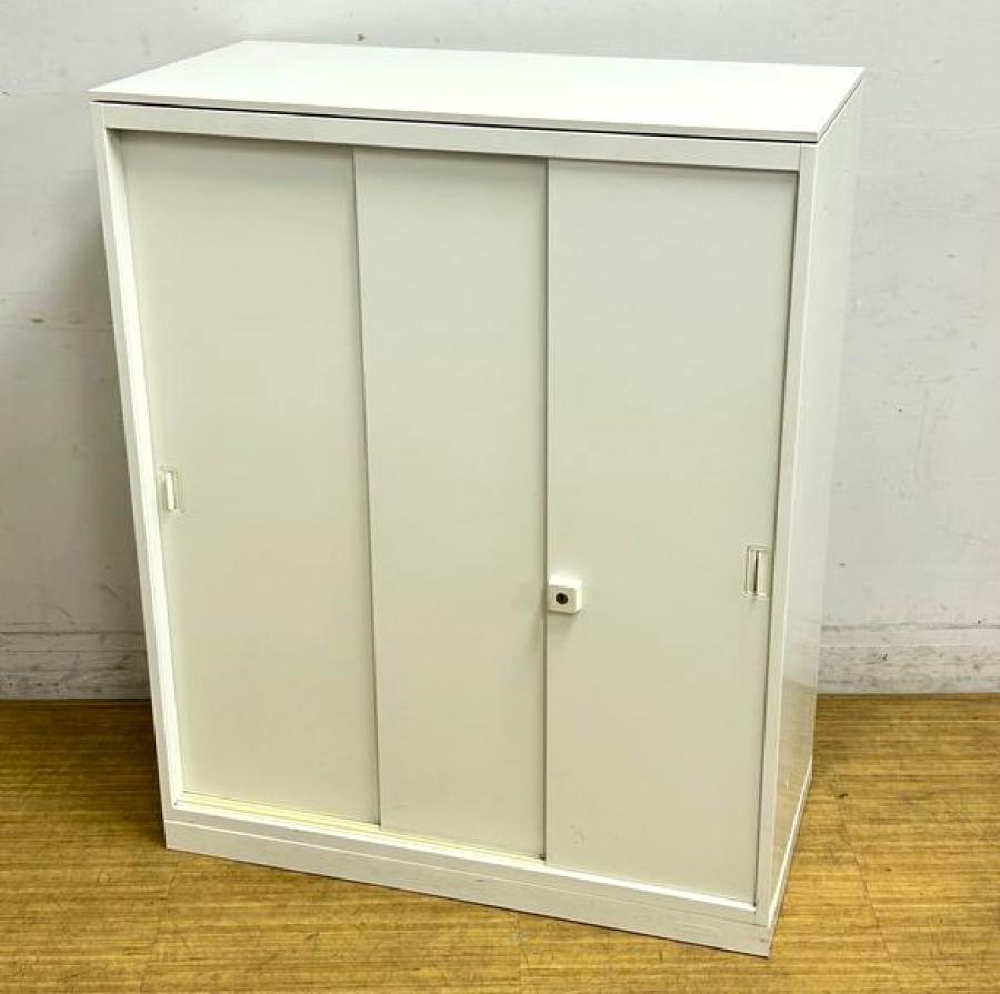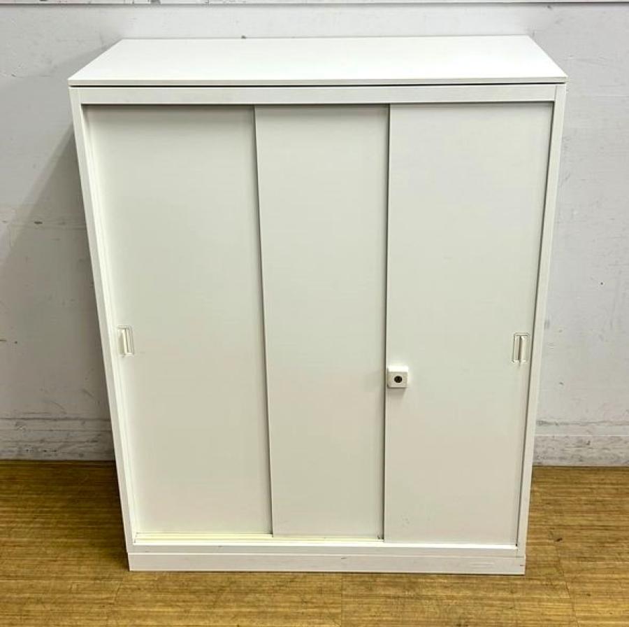 【在庫入替セール】ホワイトキャビネット 使いやすい3枚引き戸書庫 オカムラ レクトライン ホワイト天板付き 鍵付き シリンダー錠 ※レール部分に日焼けあります- 名古屋千種店
