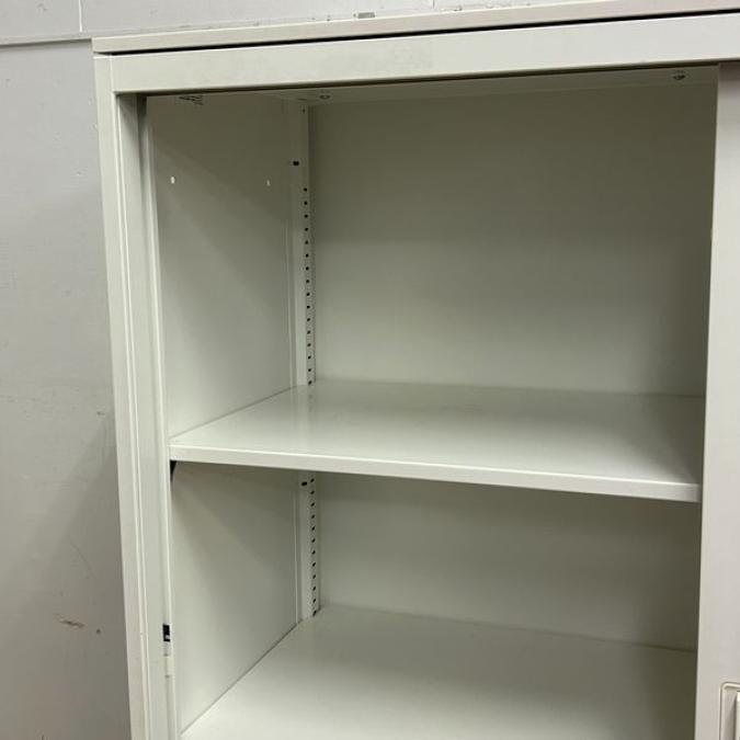 スライド式の扉のため導線を邪魔しません!使い勝手抜群の2枚引き違い書庫が入荷! ■オカムラ/レクトライン/ホワイト 2枚引き戸