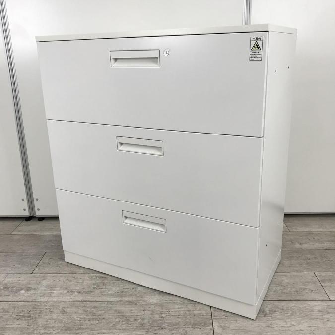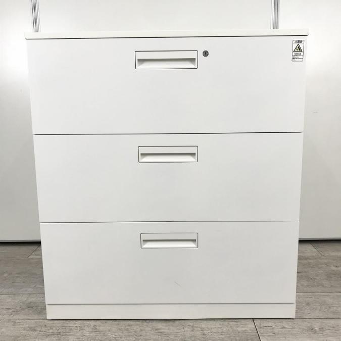 【4台入荷】【収納力抜群の3段ラテラル書庫!A4書類が大量に収納可能!】■コクヨ(KOKUYO)製 エディア(EDIA)シリーズ 3段ラテラル ローキャビネット ■天板/ベース付き ■ホワイト ■シリンダー錠