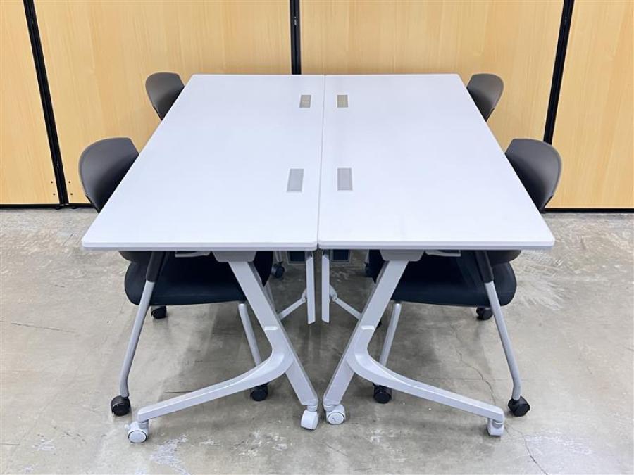 スタックテーブル2台+ミーティングチェア4脚のセット!【4名様で使えます!キャスター付きで移動も楽々!】■オカムラ/カルドー/サイドスタックテーブル/幅1500×奥行600/ホワイト天板×幕板付■ミーティングチェア/コクヨ/プロッティ【天板跳ね上げ式でコンパクトに収納】 【弊社使用欄:A00976001/A00979106】/オススメ(おすすめ) /人気商品- 在庫数