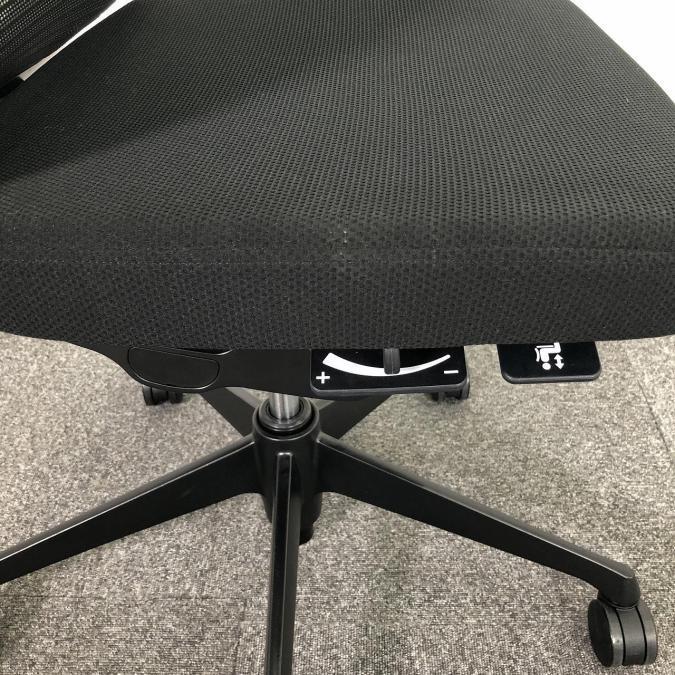 リクライニングの固定と解除、リクライニング反力の強弱、座面の高さ調整、座面のスライド調整の操作を、すべて座面の裏側に集約。