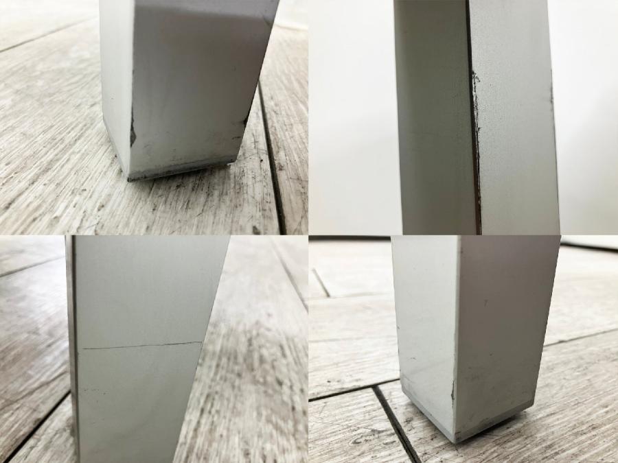 - 目立つ箇所複数あり深い傷・凹みが商品全体にある。(例、天板、幕板、棚板、サイド部分、脚部等にある。)