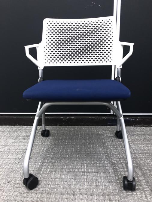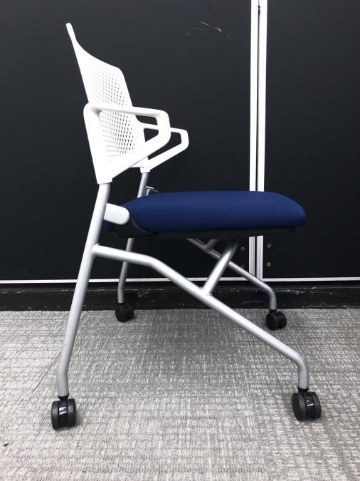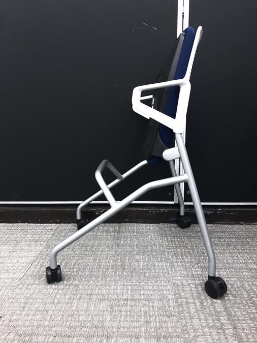 【折り畳んで収納!キャスター付で動作も楽々!】■ウチダ(UCHIDA)製 FM-345シリーズ 肘付 ネスティングチェア 会議用 キャスター付 ■背面樹脂メッシュ ■ブルー×ホワイトシェル