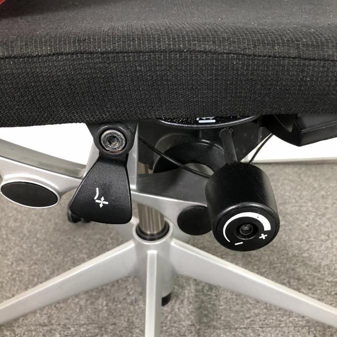 座面のすぐ右下にあるレバーの操作により、座面位置の上下調整(100mm)が可能です。