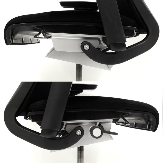 - レバーを引き上げながら座面を前後にスライドさせ、レバーを放すとロックします。背もたれに身体をつけた状態で膝の裏側と座面のエッジの間に5-8センチほどの隙間ができるのが理想的です。