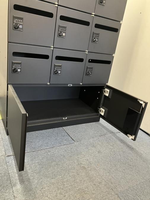 【省スペースで15人分収納できます!ブラックのかっこいいロッカー】【両開き書庫を連結仕様】 ■イトーキ製 15人用ロッカー 3列×5段+両開き書庫 ■メール投函口付 ブラック ■ダイヤル錠- 名古屋本店
