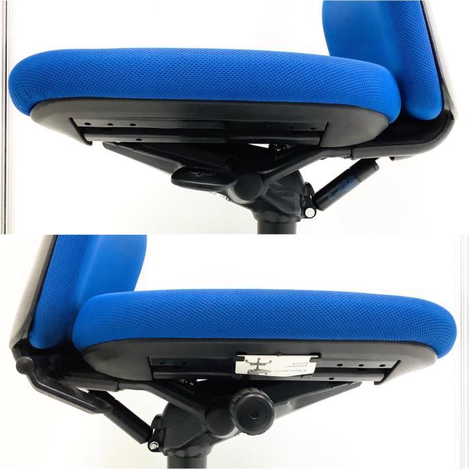 もう一つは、オカムラ社独自の""異硬度クッション""が座面に採用されていることです。これは座面が位置により異なる硬さのウレタンでできており、前方は腿裏を圧迫しないようソフトに、後方はしっかりと体重を支えるために少し硬めに作られています。クッション性とホールド感の両立により、長時間の作業での疲れを軽減してくれます。"