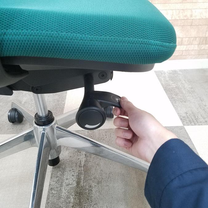 - 座面右下のダイヤル操作で、リクライニングの強弱調整が行えます。これまでのダイヤル式よりも、少ない回転数で、最弱?最強の調整が可能です。