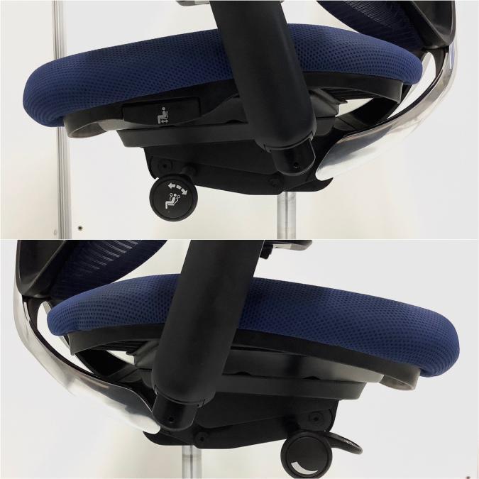 - 椅子と背が連動する「シンクロリクライニング」。リクライニング角度は直立ポジションから前方に10度、後方に23度です。