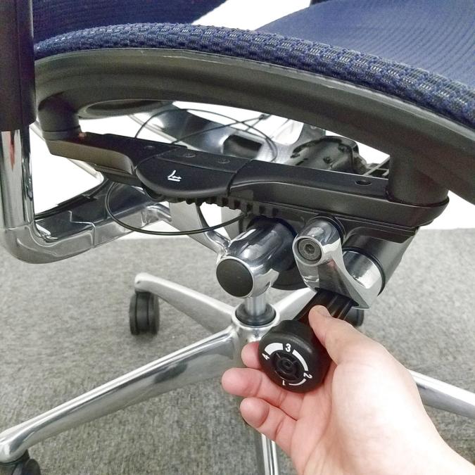 - ロッキングの強弱を調整するダイヤルがございます。体型に合わせてリクライニングの固さを座ったままで調整できます。