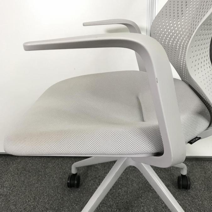 【腰回りをしっかりサポート!オフィスに新しい風を吹き込むライトタスクチェア】■イトーキ製(ITOKI) キュアチェア(QuA) ミーティングチェア 固定肘つき ■樹脂メッシュバック 4本脚 ■ライトグレー- つくば店