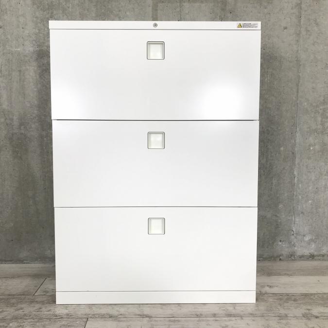 オカムラ レクトライン 3段ラテラル書庫 ホワイト天板 シリンダー錠 鍵付き ※取っ手部分に若干日焼けあり