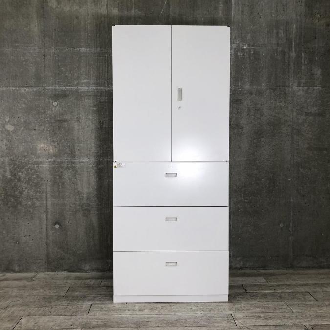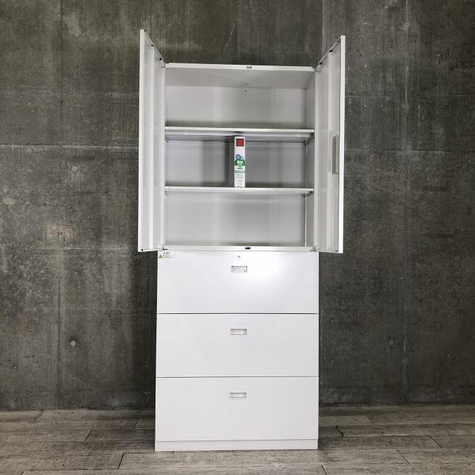 【両開き+3段引き出し式の人気の書庫セット!】■イトーキ製 シンライン 上下書庫セット 両開き+3段ラテラル ■ホワイト ■シリンダー錠※取っ手部分ヤケ有※- 品川・三田店