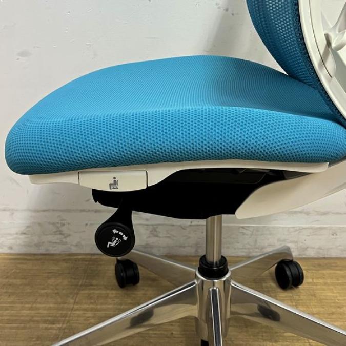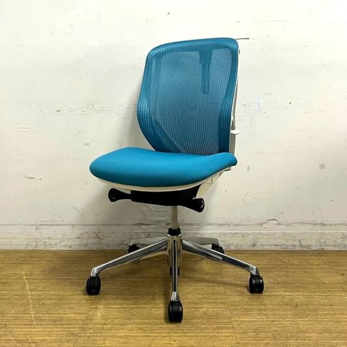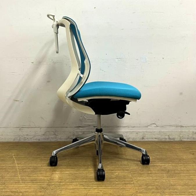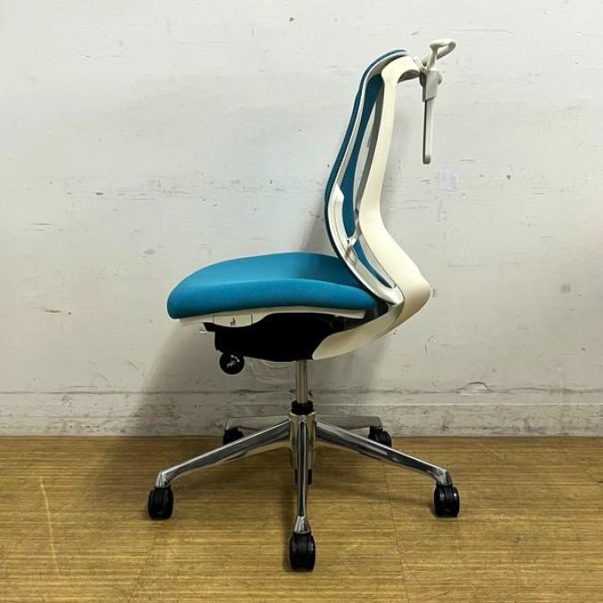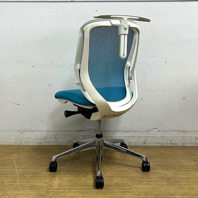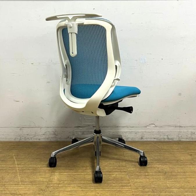 【在庫入替セール】オカムラ シルフィー ローバック メッシュタイプ 肘無しモデル ブルーグリーン×ホワイトフレーム ポリッシュ脚 コートハンガー付き- 名古屋千種店