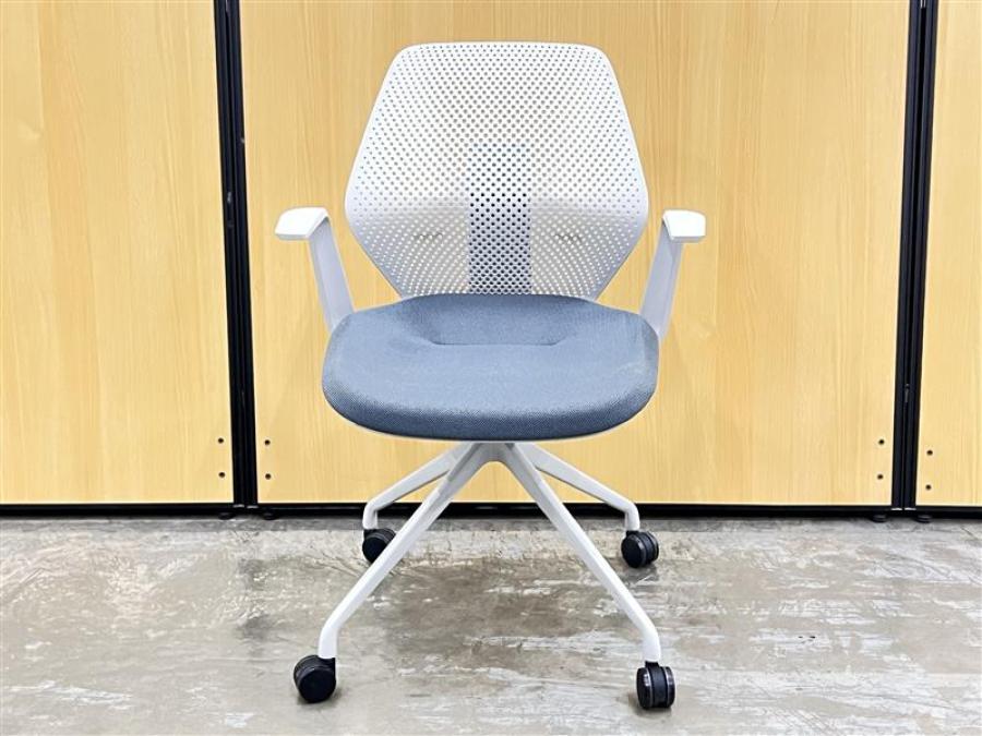 【オフィスに新しい風を吹き込むライトタスクチェア!】【腰回りをしっかりサポート!】■イトーキ製(ITOKI)製 キュアチェア(QuA) 肘付き ミーティングチェア ■背面樹脂メッシュタイプ 4本脚 キャスター付き ■固定肘 ■ペールアクアブルー×ライトグレーシェル