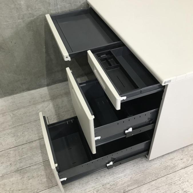 引出しを引くのと同時にロックが外れるラッチ機構を採用しています。