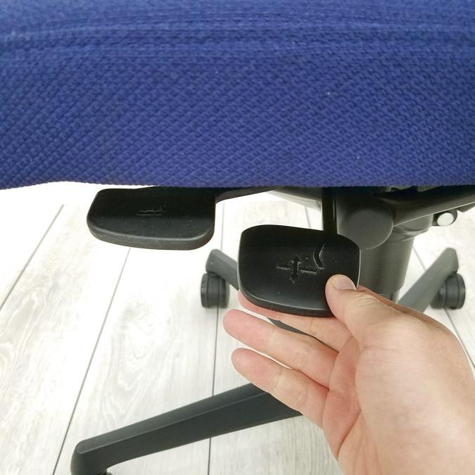 座面の左下にあるレバー操作で座面位置の上下調整(92mm、無段階)が可能です。