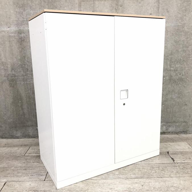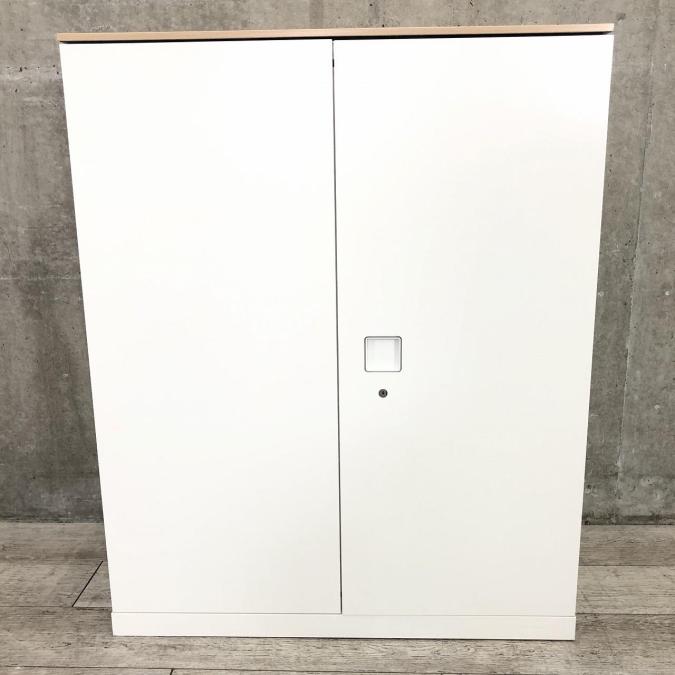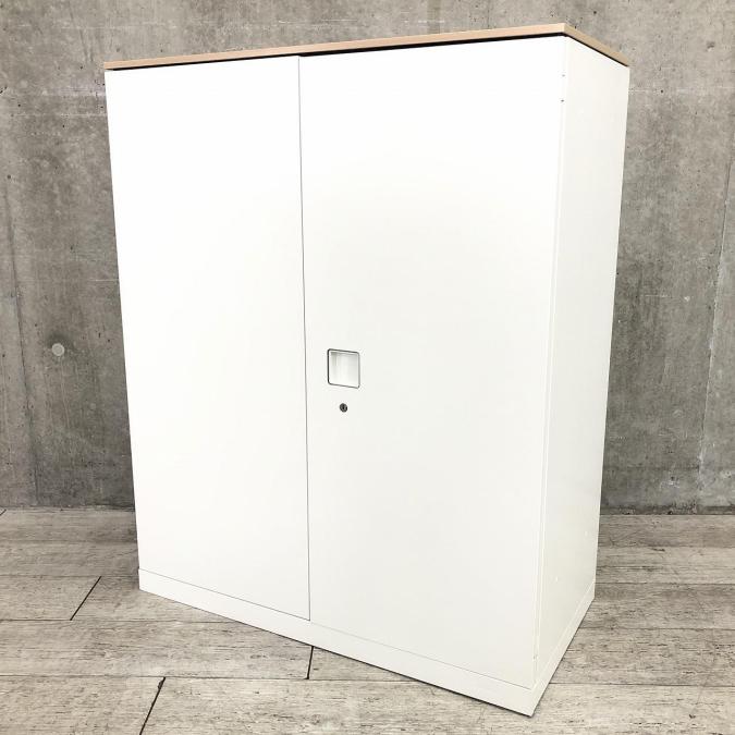 【在庫入替セール品!】【オフィスの書類をスッキリ整理!取っ手がどの方向からでも開くマルチハンドル!】■オカムラ(okamura)製 レクトライン 両開き書庫 ローキャビネット ■シリンダー錠 ■ホワイト/天板:ナチュラル- 池袋店