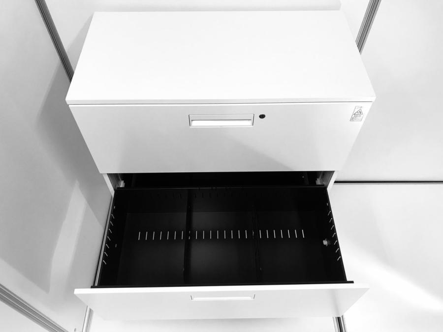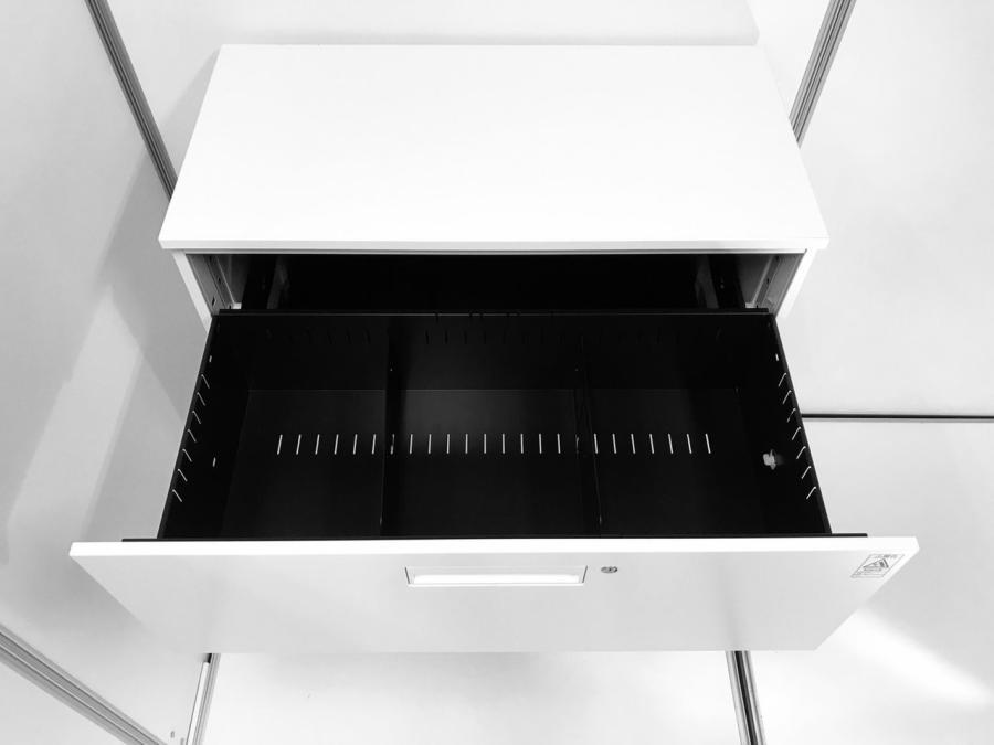- 両開きタイプは扉が180度開き、通路の邪魔になりません。ラテラルタイプは引出しが限界まで出せ、出し入れ楽々。