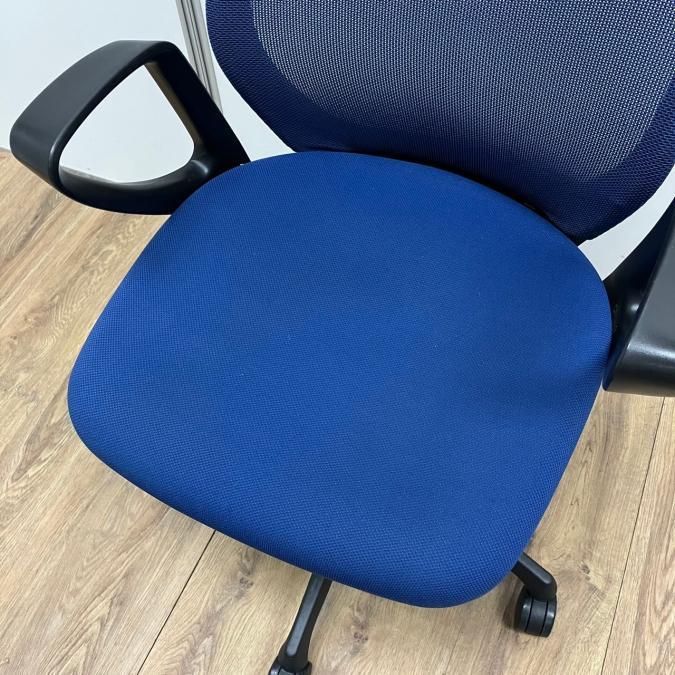【商品入替のため、在庫限り】オカムラ製 CG-Mシリーズ ブルーカラー 背もたれメッシュ仕様 サークル※固定肘 肘付きローバックチェア!!【関西】- 京都東寺店