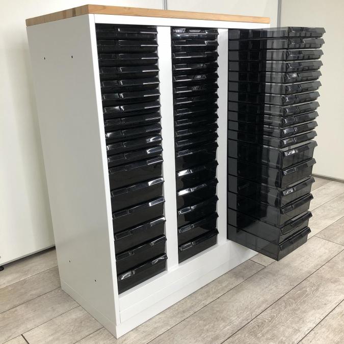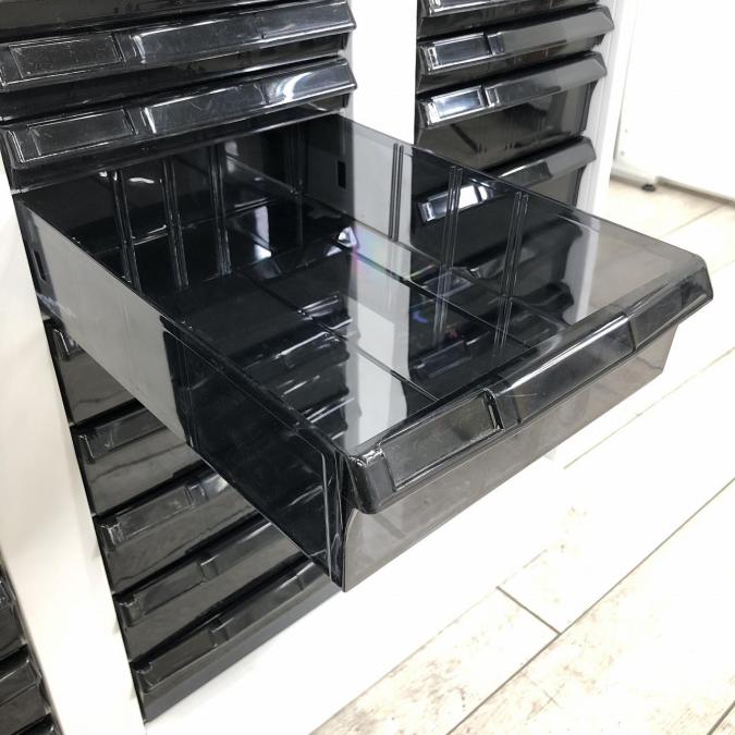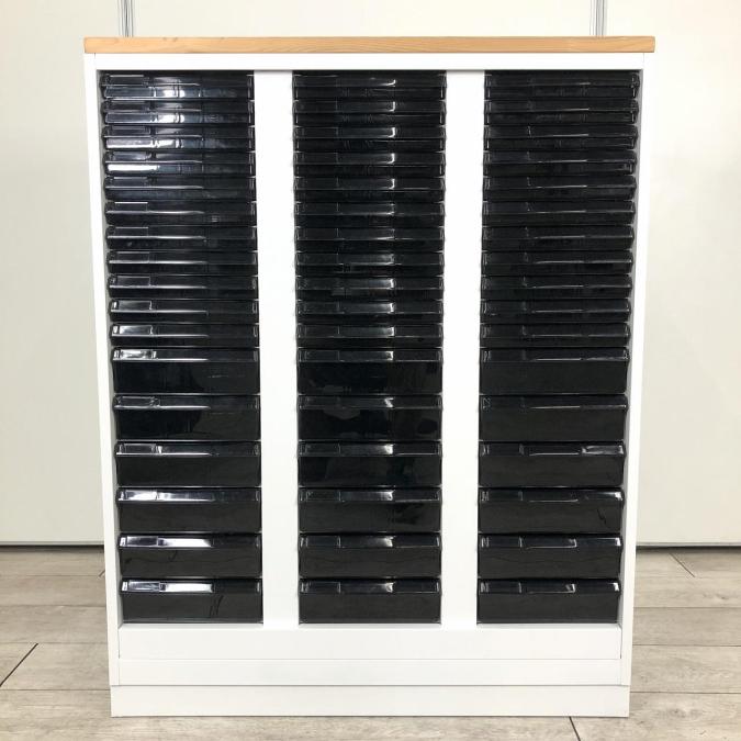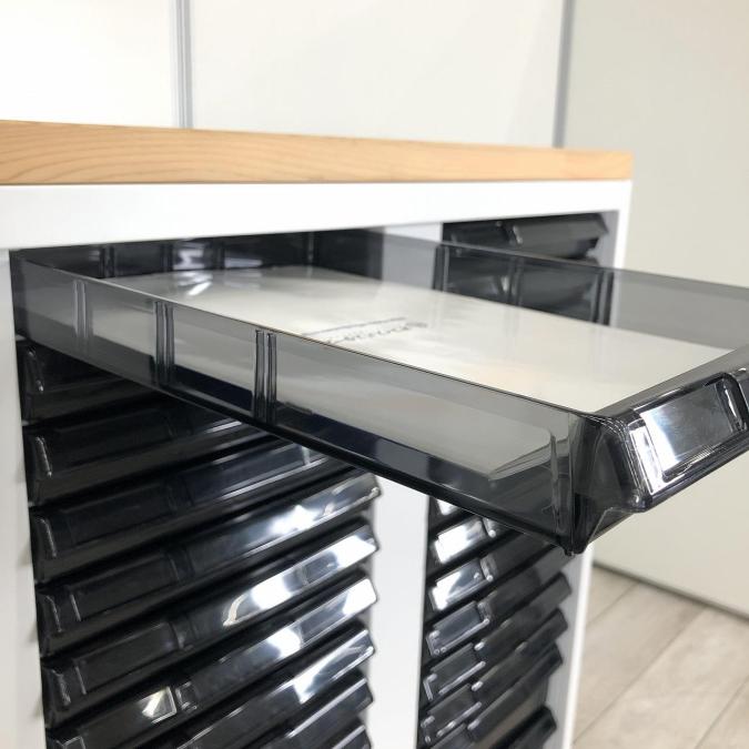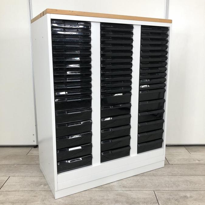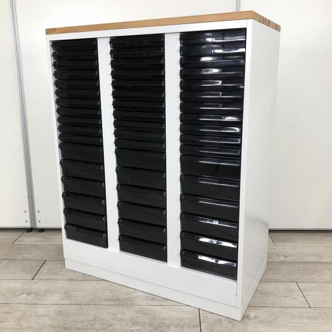【書類・備品整理の必需品!】【珍しいクリトレが入荷!3列×浅型11段+深型6段】■ウチダ(UCHIDA)製 BEストレージシリーズ クリスタルトレー ローキャビネット ■3列×浅型11段+深型6段 ■色:ホワイト/トレイ:ブラック