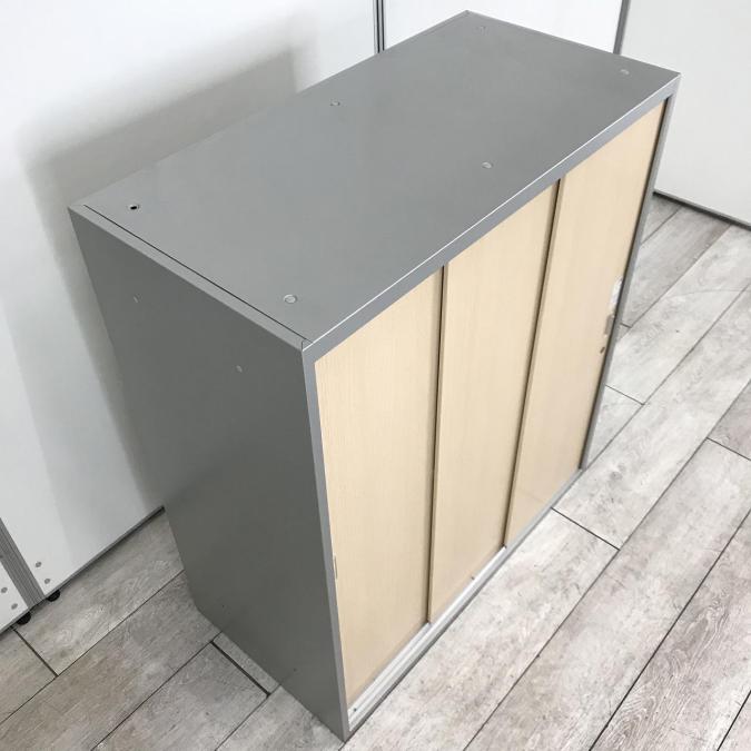 【お問い合わせの多い引違い書庫!スライド引き戸だから開閉スペースに困りません!】オカムラ(okamura)製 レクトライン 引違い書庫 3枚引き戸タイプ ローキャビネット ■木目ナチュラル (側/上面シルバー) ■シリンダー錠サーキュラーバリューCO2削減量の算出について