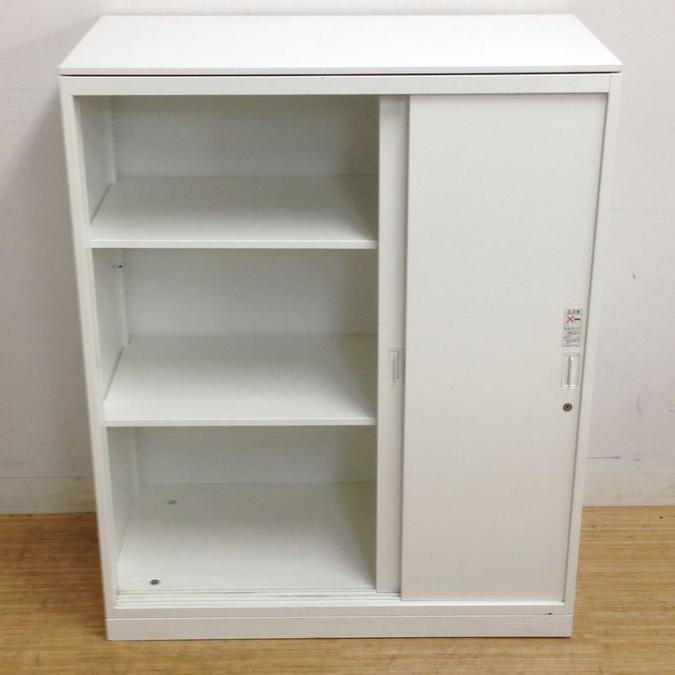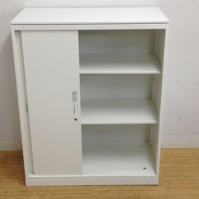 使いやすい3枚引き戸書庫 オカムラ レクトライン ホワイト天板付き 鍵付き シリンダー錠 ※レール部分や取っ手に日焼けあります- 名古屋千種店