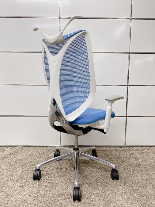 【T11】【T9】【K7】【商品入替のため、残り5脚限り】オカムラ製 サブリナシリーズ アクアブルー 背もたれ/アクアブルーx座面/ダークブルーのツートンカラー ホワイトフレーム アジャストアーム※可動肘 前傾チルト付 流れるような美しいフォルムの最高級メッシュチェア! 肘付きハイバックチェア!!